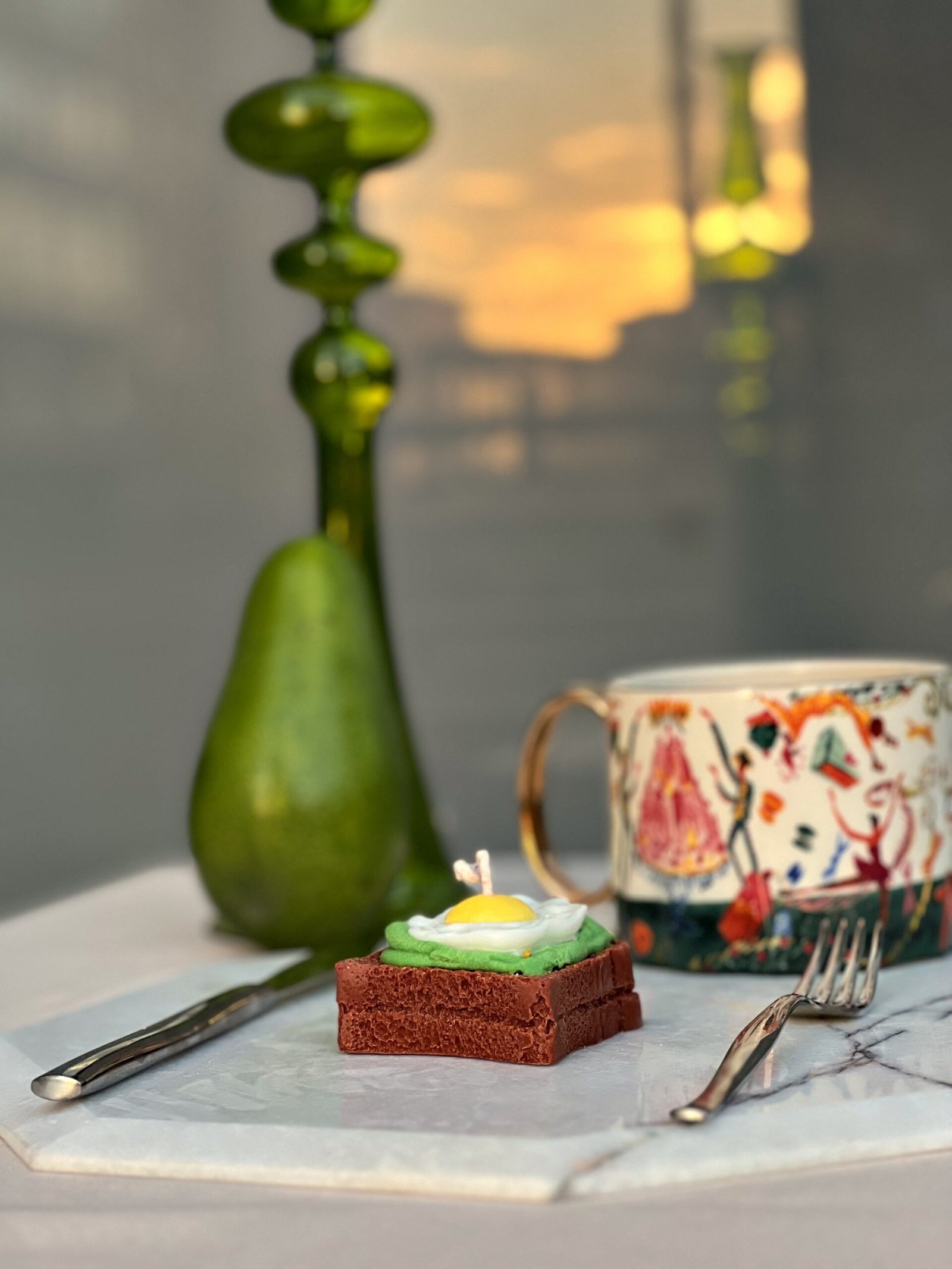 Gerçek tost ekmeği dokusu, kremsi avokado efekti ve tam ortasında yer alan parlak “yumurta sarısı”yla ultra gerçekçi bir görünümü olan özel tasarım bir dekoratif mumdur.