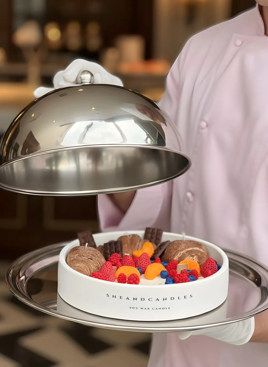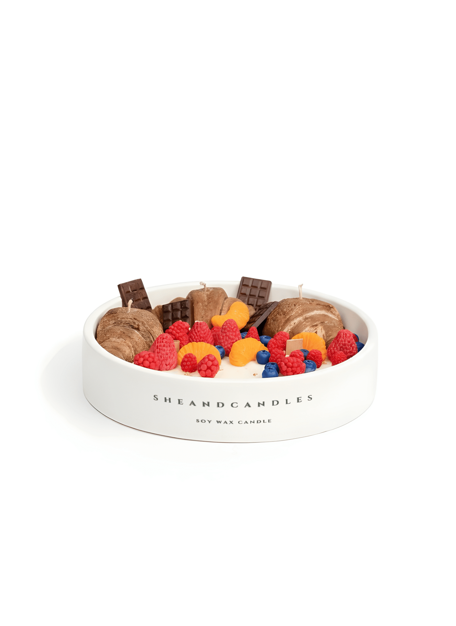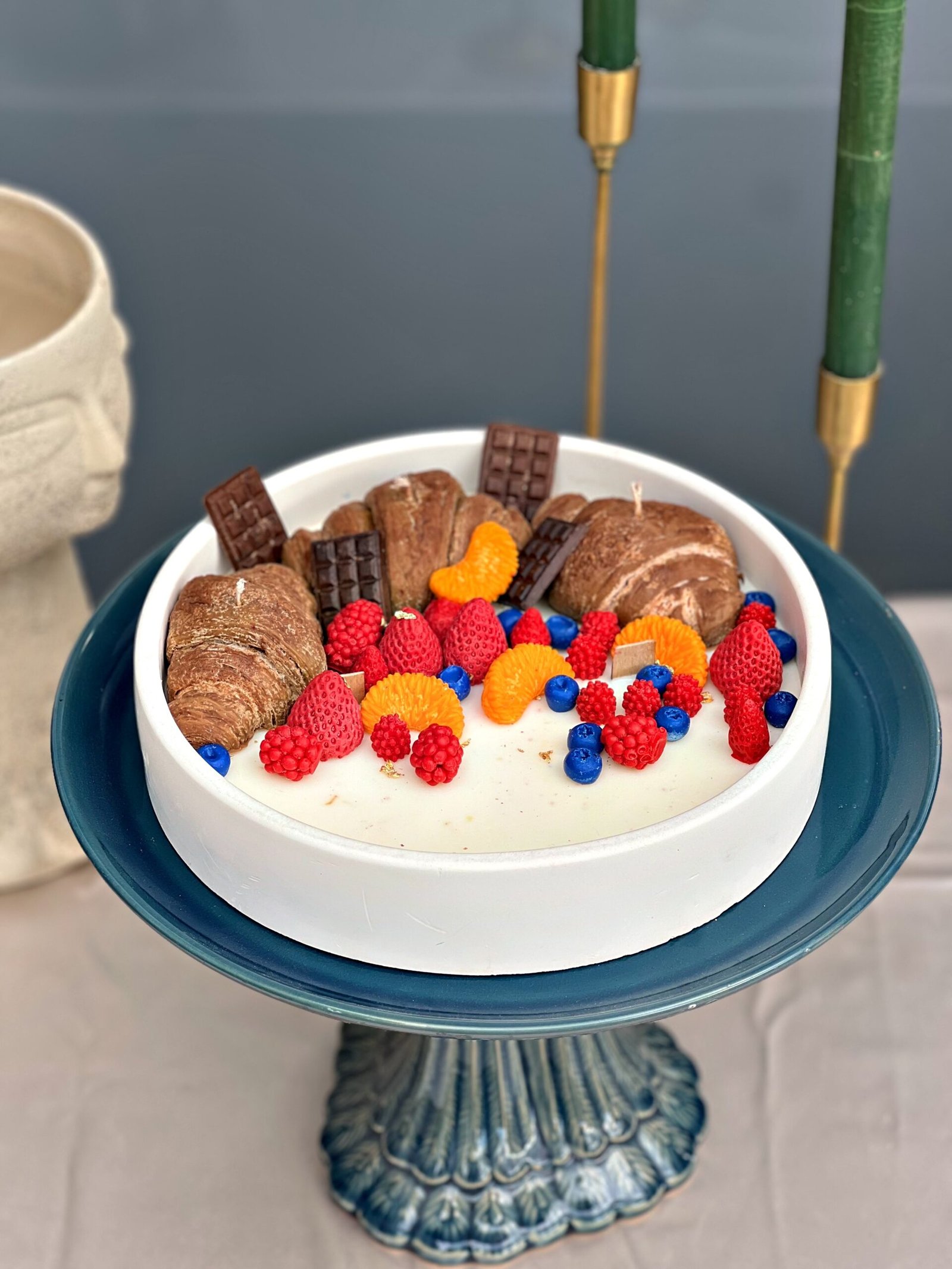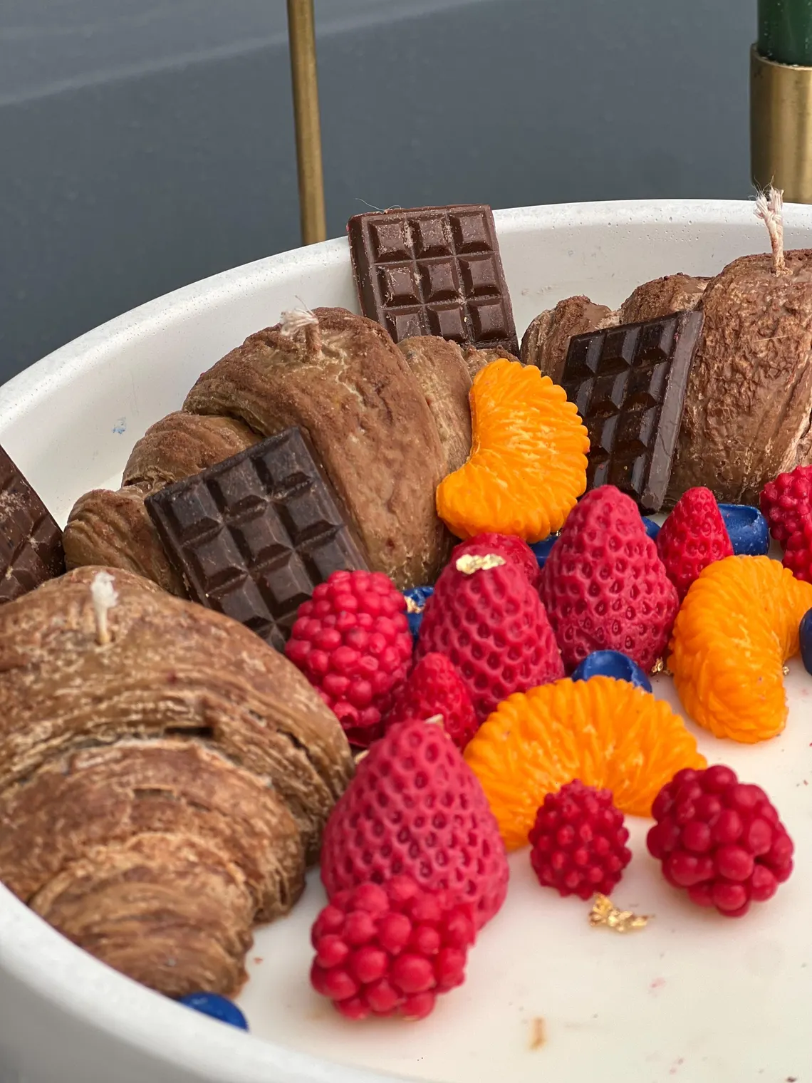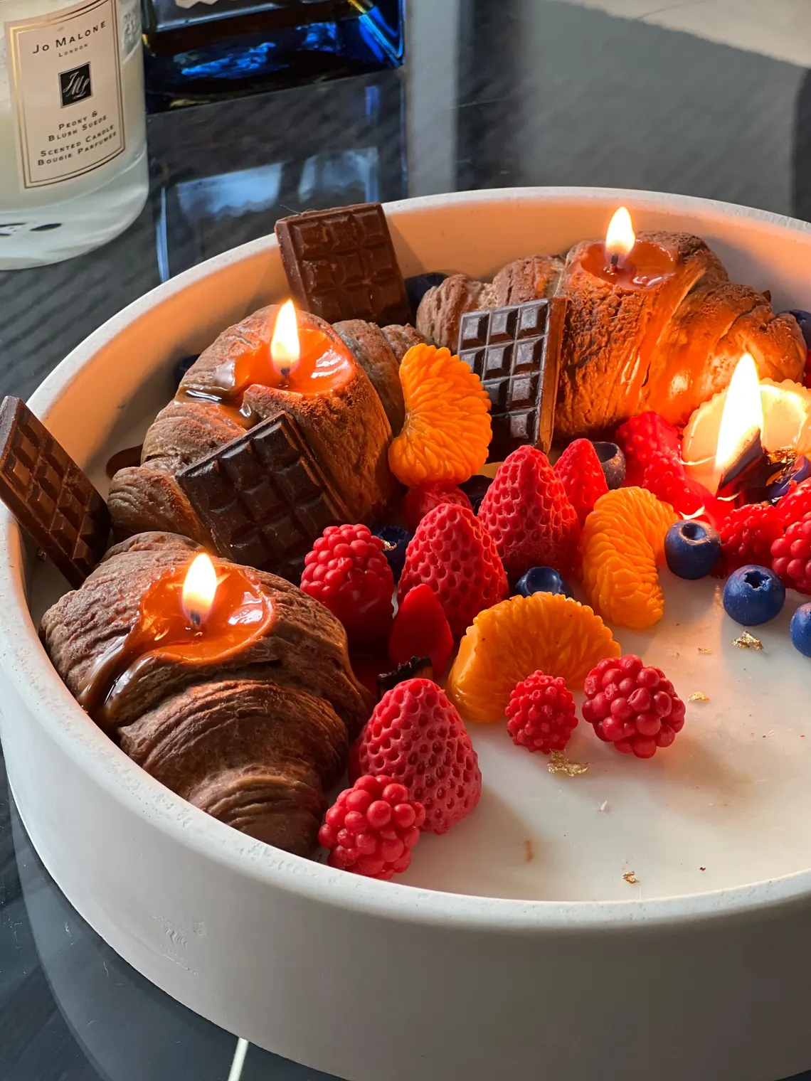 Fransız pastanelerinin benzersiz tatlı atmosferinden ilham alan bu özel mum, gerçek kruvasanların, çikolata parçalarının ve renkli meyvelerin birebir el işçiliğiyle modellendiği, tamamen dekoratif ve koleksiyon niteliğinde bir tasarımdır. Her detay tek tek elde şekillendirilmiş olup gerçekçi renk geçişleri, doku katmanları ve parlak meyve efektleri ile dikkat çeker.