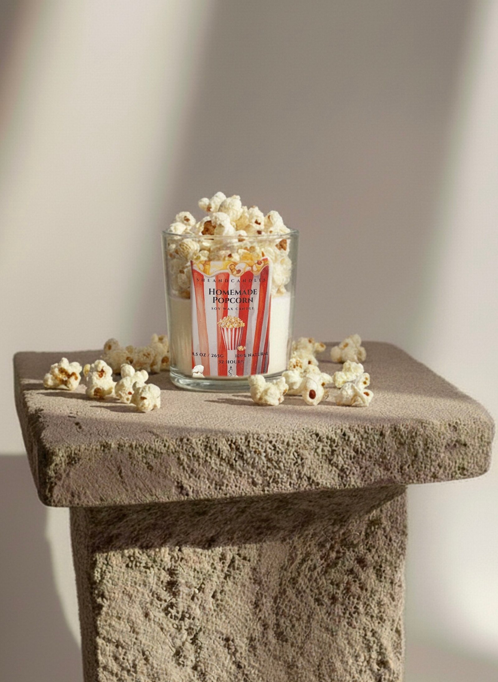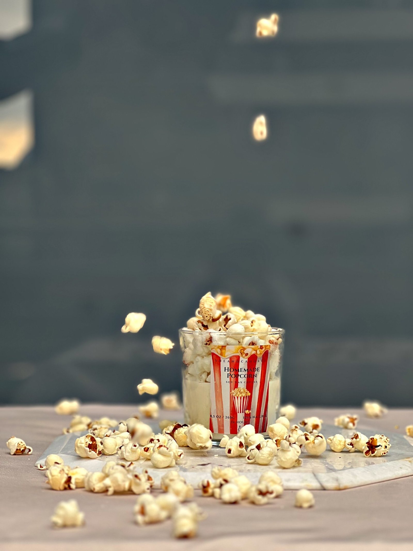 Sinema gecelerinin vazgeçilmez atıştırmalığı olan patlamış mısırdan ilham alınarak tasarlanan bu özel mum, gerçek popcorn dokusunu birebir yansıtan detaylarıyla dikkat çeker. Her bir popcorn tane el işçiliğiyle tek tek hazırlanır ve doğal, sertifikalı soy wax kullanılır.