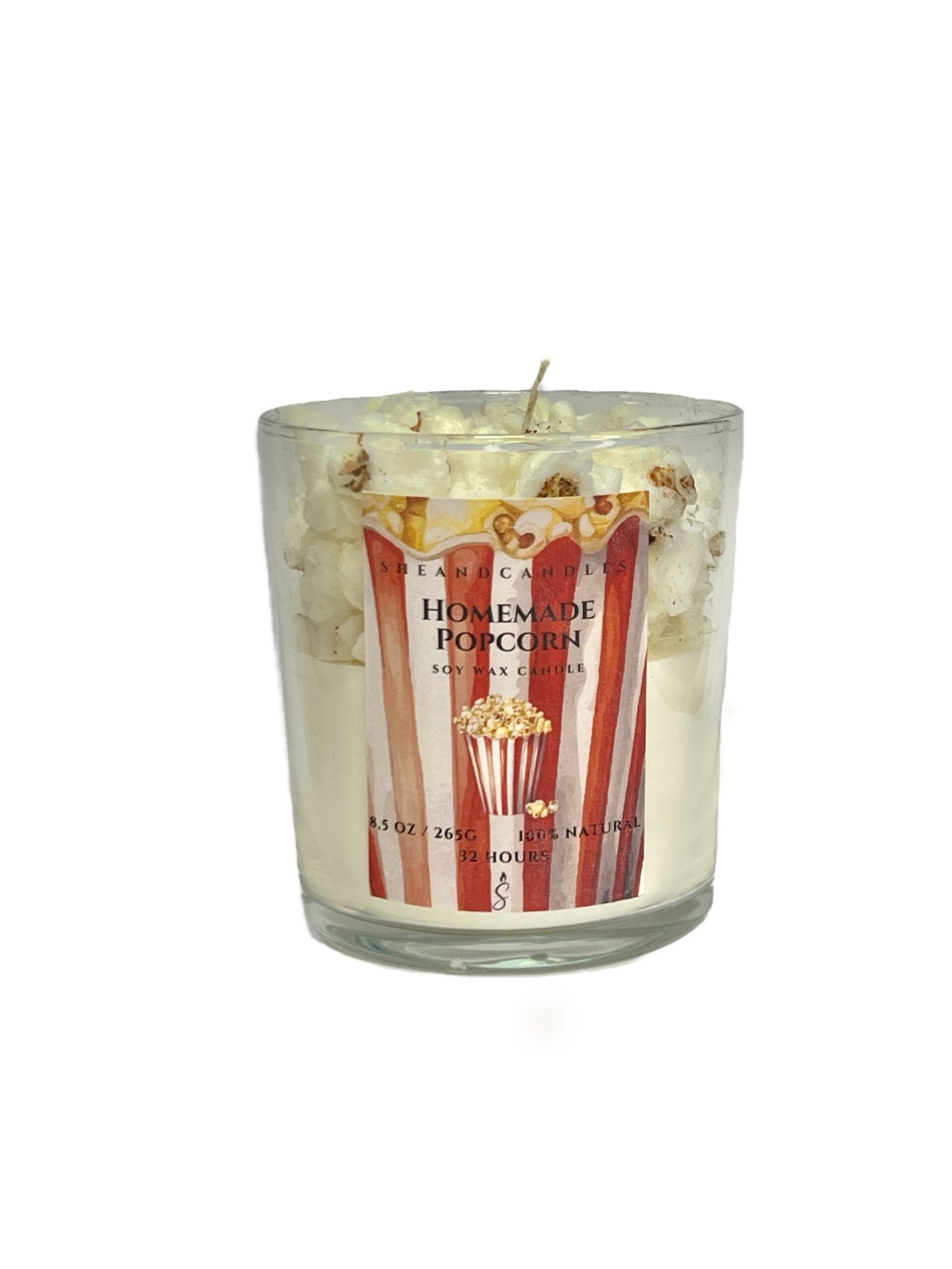 Gerçek patlamış mısır görünümünde, tamamen el yapımı dekoratif mum. %100 sertifikalı doğal soy wax, parafinsiz ve temiz yanış sağlar.