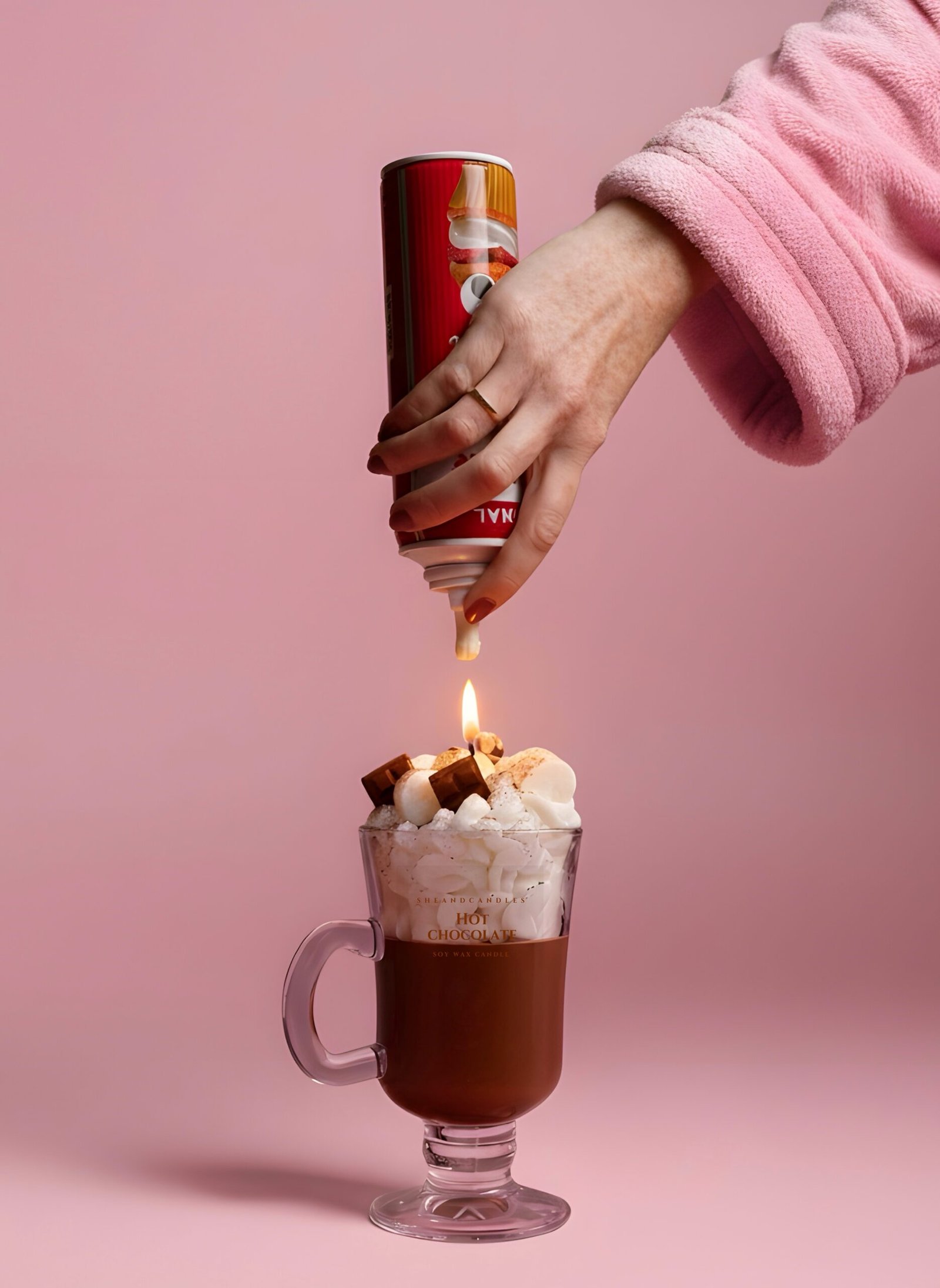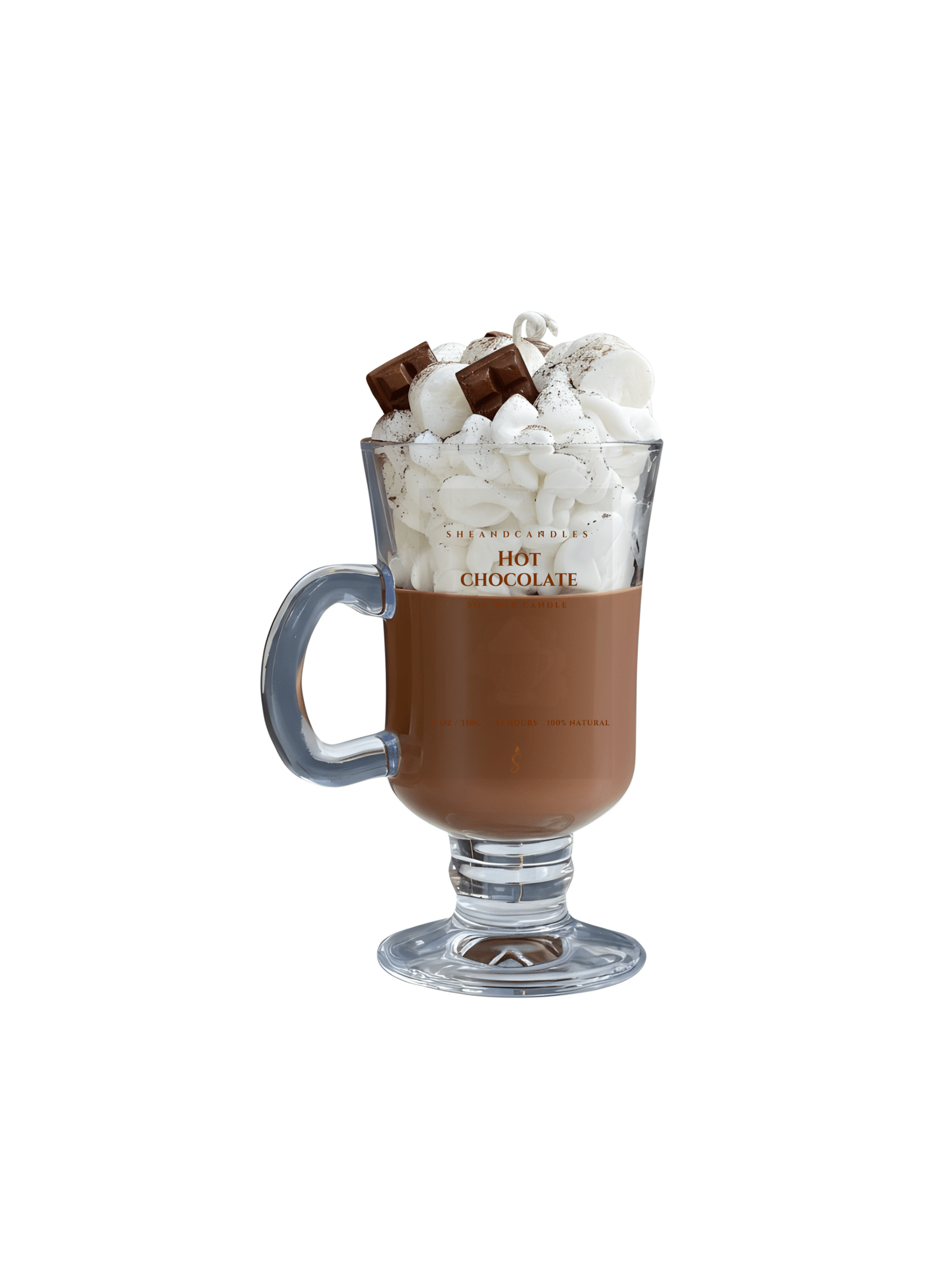 Hot Chocolate, soğuk kış günlerinin en sıcak anlarından ilham alınarak oluşturulmuş, gerçekçi sıcak çikolata görünümünde el yapımı dekoratif bir mumdur. Üst kısmındaki mini marshmallowlar, çikolata parçaları ve kakao serpiştirme efekti tamamen soy wax’tan elde edilmiştir ve titiz bir el işçiliği gerektirir.